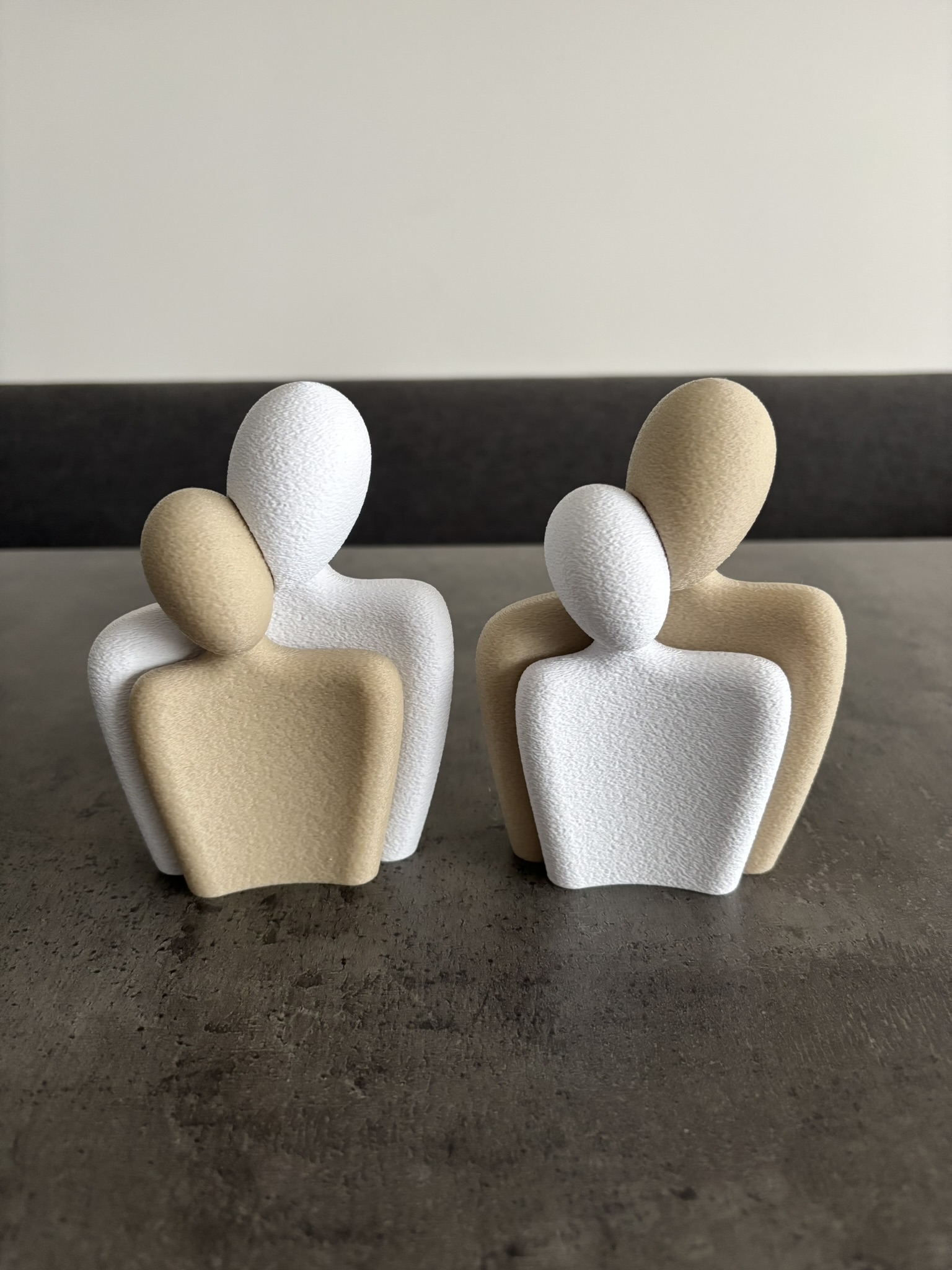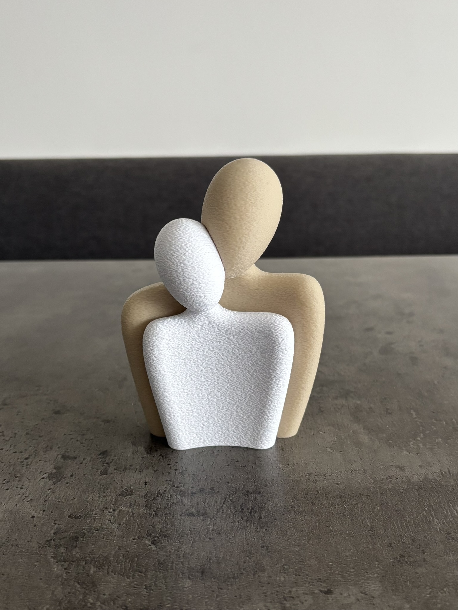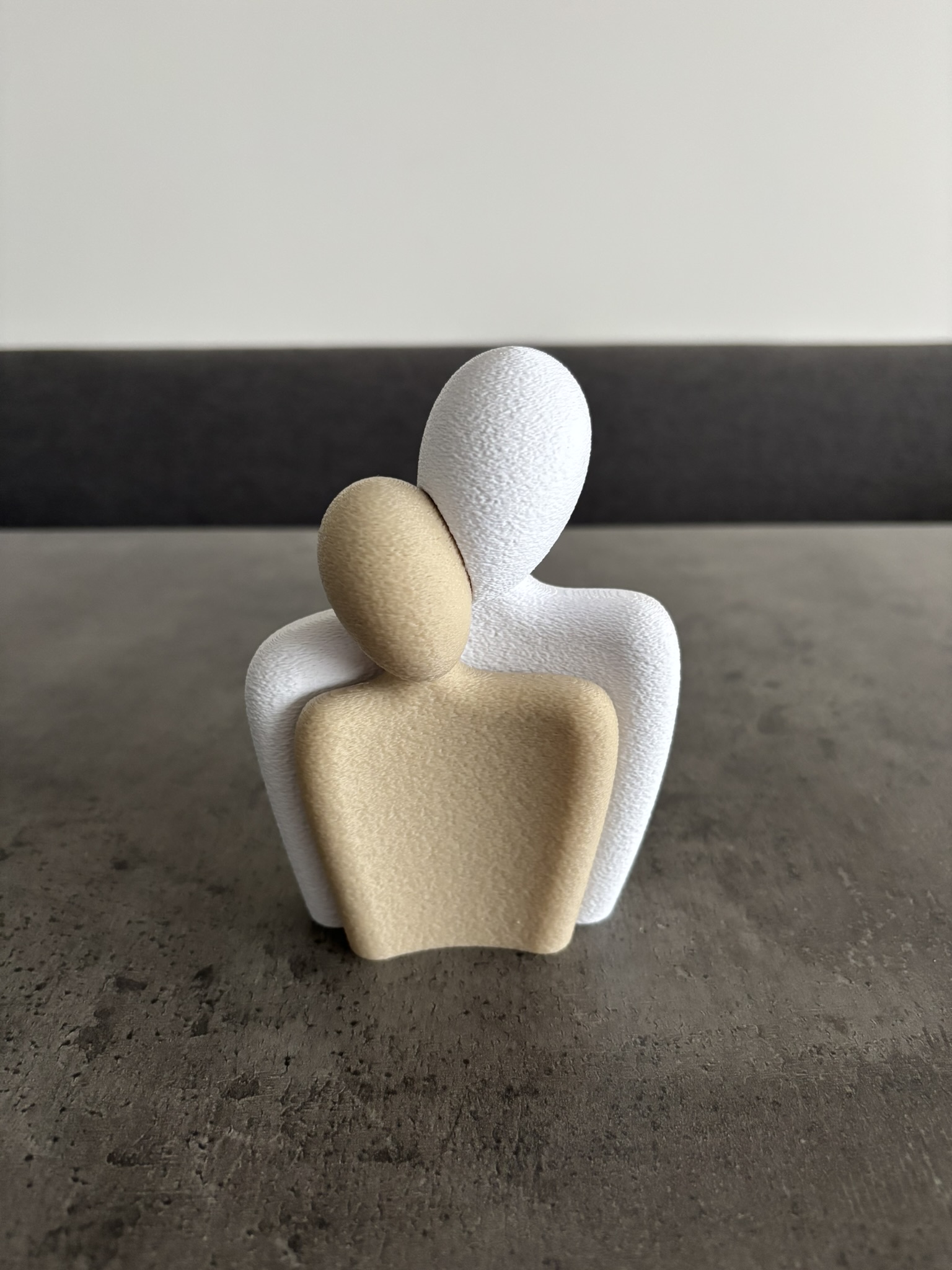 Die ruhige Linienführung und die sanft strukturierte Oberfläche verleihen der Skulptur einen modernen, zeitlosen Look. Die zweifarbige Gestaltung unterstreicht die Symbolik – zwei eigenständige Elemente, die miteinander verschmelzen.