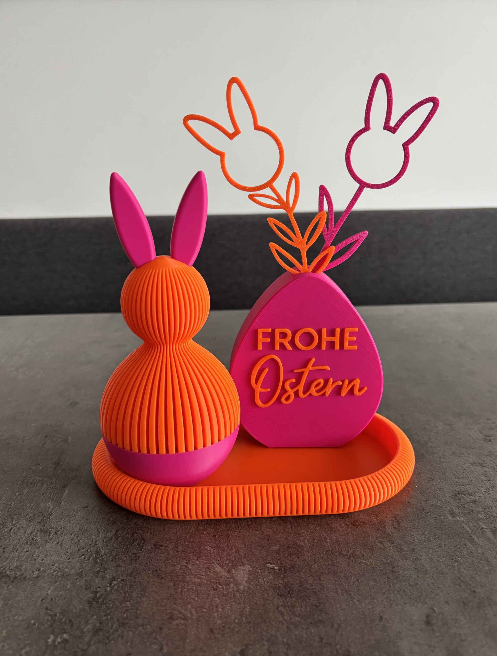 Der strukturierte Hase Hop Secret wird ergänzt durch eine Vase mit dem Schriftzug „Frohe Ostern“, aus der zwei minimalistische Blumensilhouetten mit Hasenköpfen wachsen. Alle Elemente stehen auf einem passenden Tablett und ergeben zusammen eine moderne, verspielte Osterdekoration.